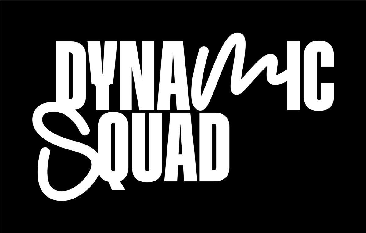 This is a clean, bold typographic logo featuring the words 'DYNAMIC SQUAD' in a modern, sans-serif typeface. The design relies on high contrast between white text and a solid black background to convey strength and professionalism.