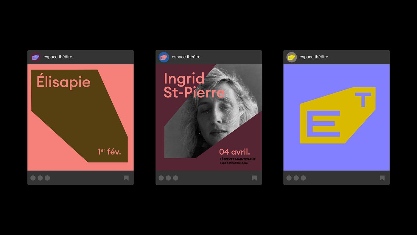 The image displays three distinct, minimalist promotional cards or tiles, likely for an event or performance. The design utilizes a clean, modern aesthetic with strong color blocking and high contrast between the background and the featured text/graphic. The overall feel is sophisticated, contemporary, and focused.