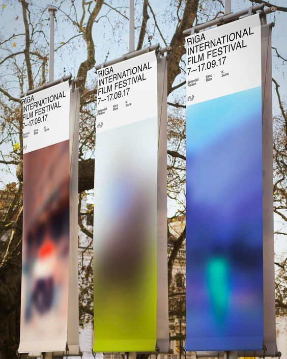 This display utilizes a clean, modern aesthetic to promote an international film festival, pairing abstract, cinematic color gradients with crisp typography. The design effectively balances visual intrigue through blurred imagery against clear informational text, creating a sophisticated and professional presentation.