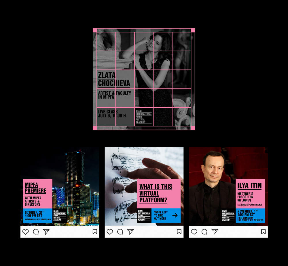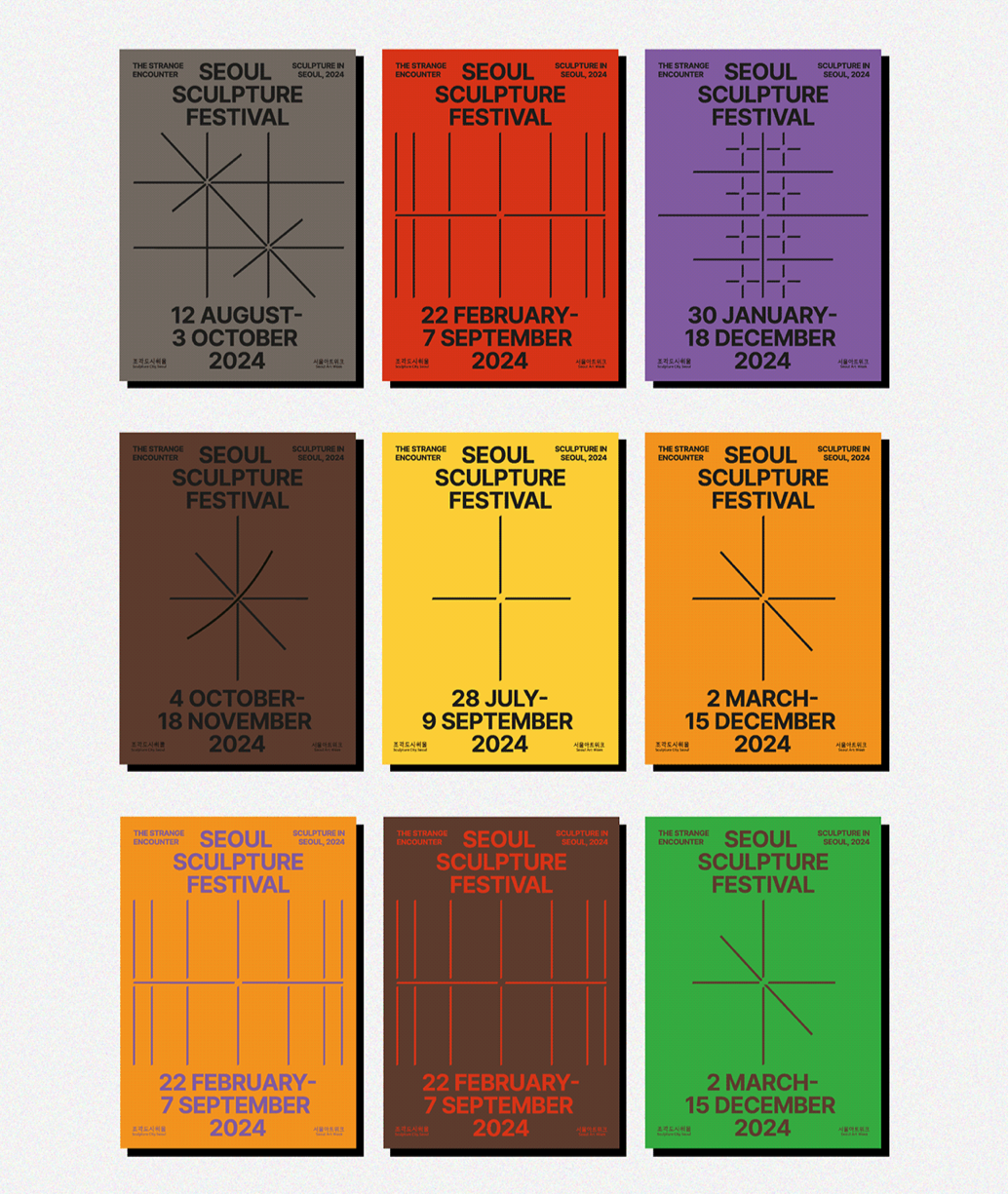 This collection of posters demonstrates a strong, modular graphic design language characterized by clean lines and high contrast. The visual identity relies on simple geometric elements and a structured layout to convey information clearly and formally.
