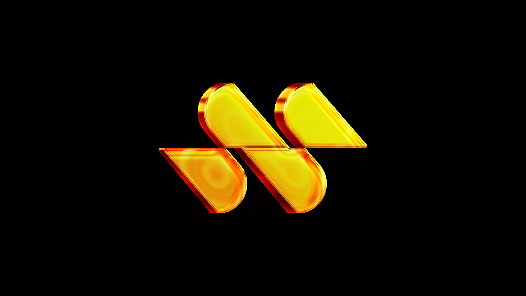This design features bold, overlapping, glossy geometric shapes rendered in warm tones against a stark black background. The visual language is modern and dynamic, emphasizing light reflection and smooth, three-dimensional form.