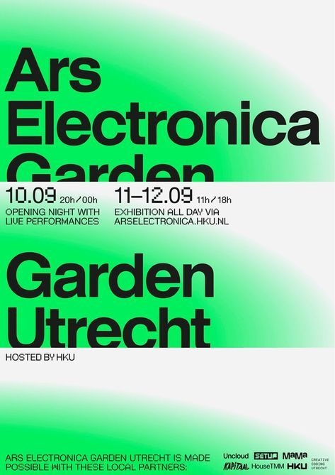 This poster utilizes a high-contrast, graphic design approach dominated by stark black typography set against a vibrant lime green background. The visual language is bold and immediate, effectively communicating an energetic and modern digital event.