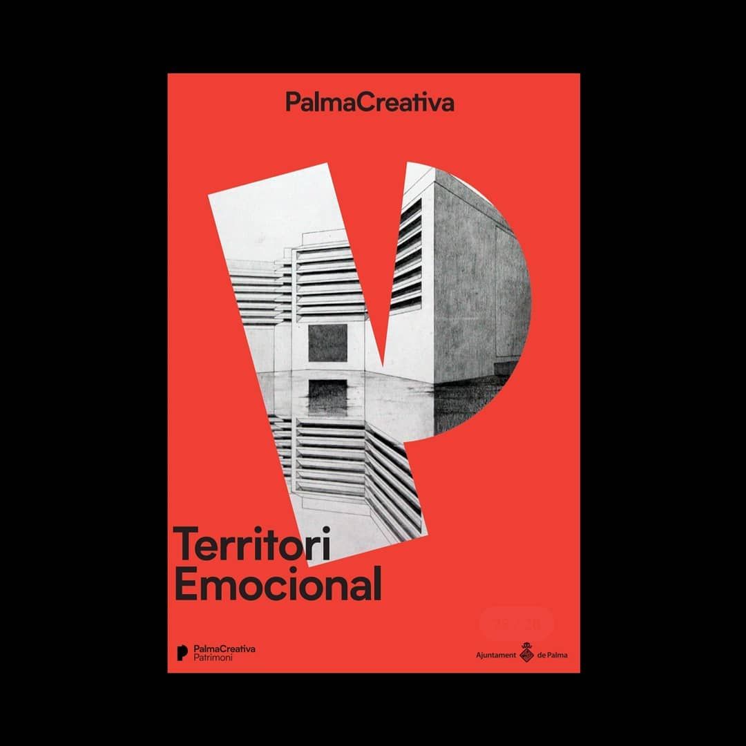 This design employs a high-contrast, graphic approach, juxtaposing stark black and white architectural lines against an intense, saturated red field. The visual language is bold and conceptual, focusing on the interplay between urban form and emotional expression.