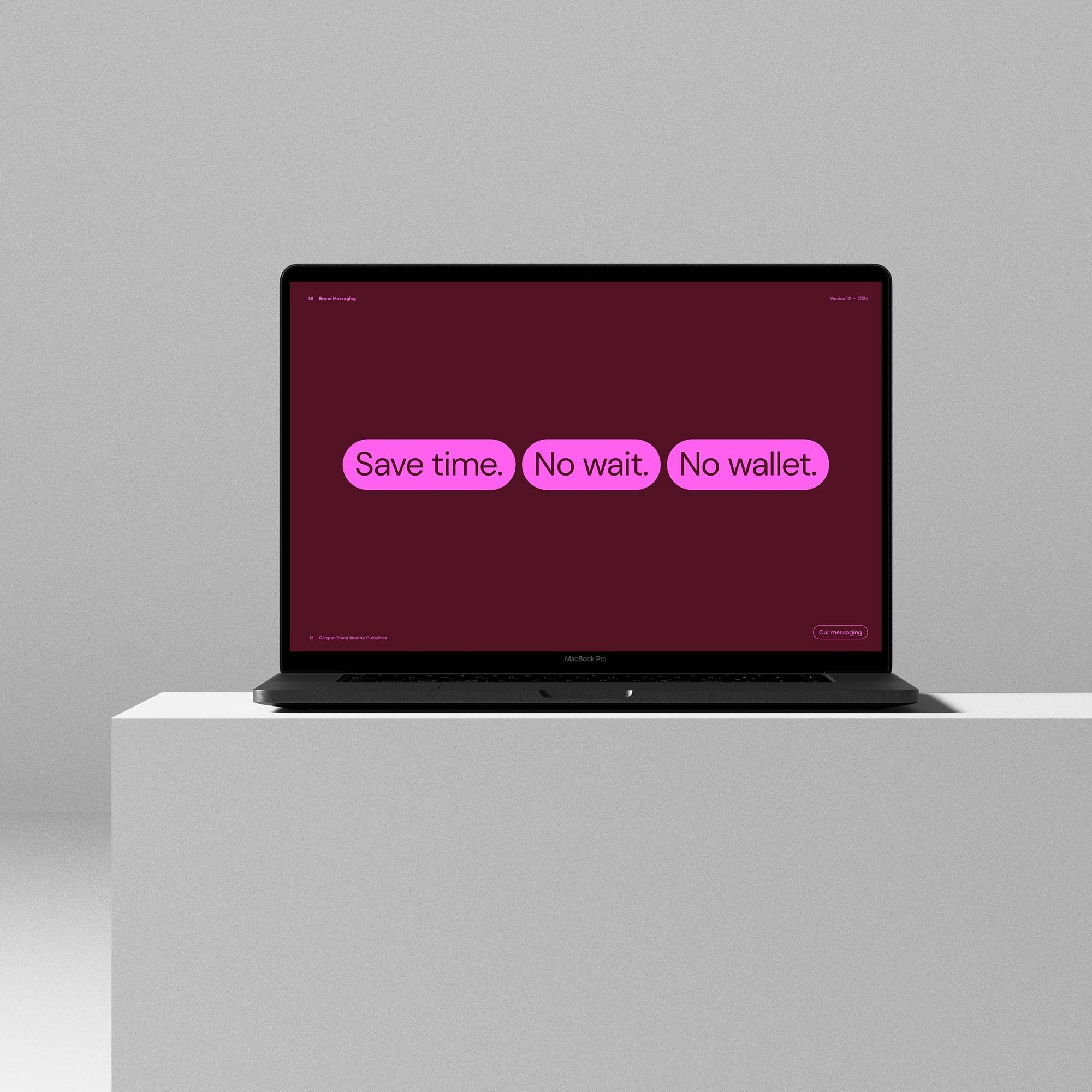 This design utilizes a strong contrast between a deep magenta background and clean white typography to deliver a direct, punchy message. The visual language is minimalist and assertive, relying on bold, rounded shapes to emphasize key benefit statements.