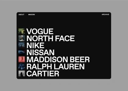 This design utilizes extreme minimalism and high contrast, relying heavily on typography to present a curated list of brands. The visual language is stark and clean, focusing entirely on the hierarchy and readability of the text against a deep black background.