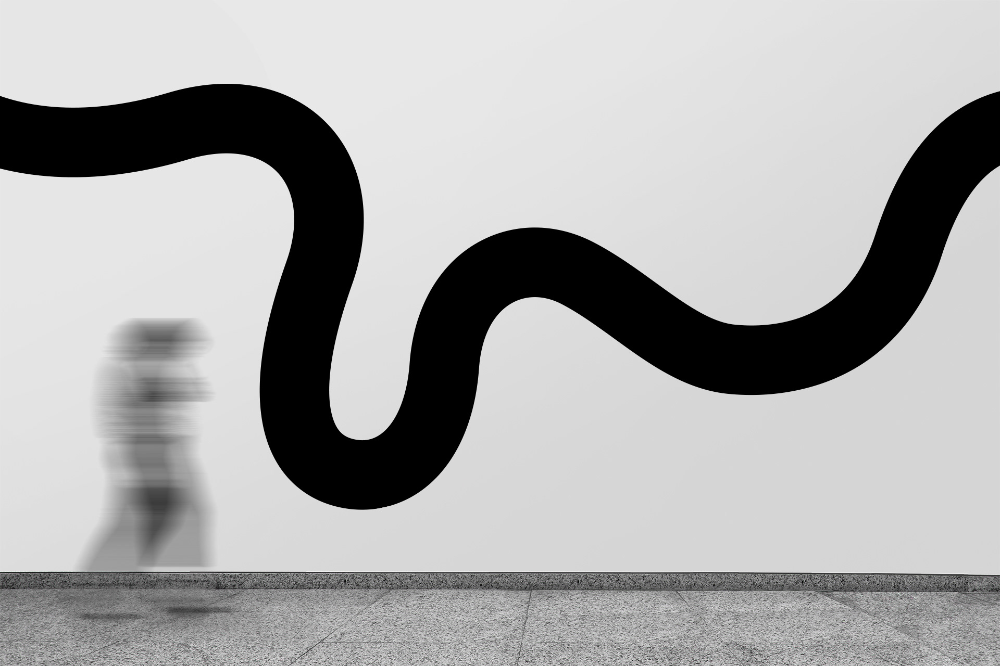 This image features a stark, minimalist composition dominated by a thick, undulating black line against a plain light gray background. The visual language relies on negative space and the dynamic curve of the line to create a sense of movement and abstract form.