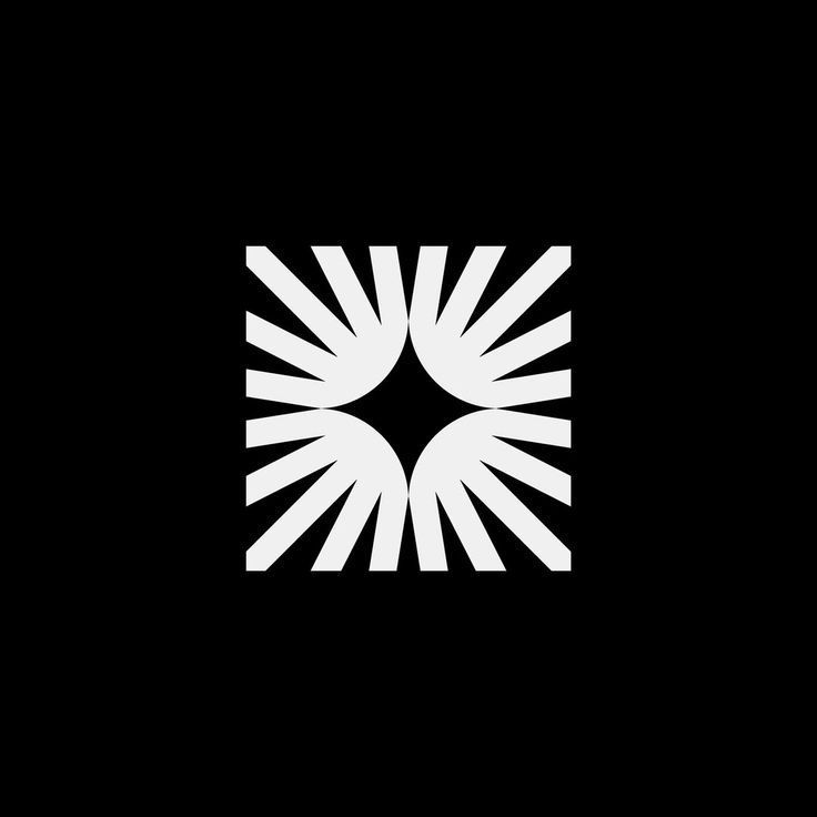This is a high-contrast, minimalist geometric design set against a solid black background. The visual language relies on stark white lines creating an intricate, symmetrical, radiating pattern that evokes a sense of balance and energy.