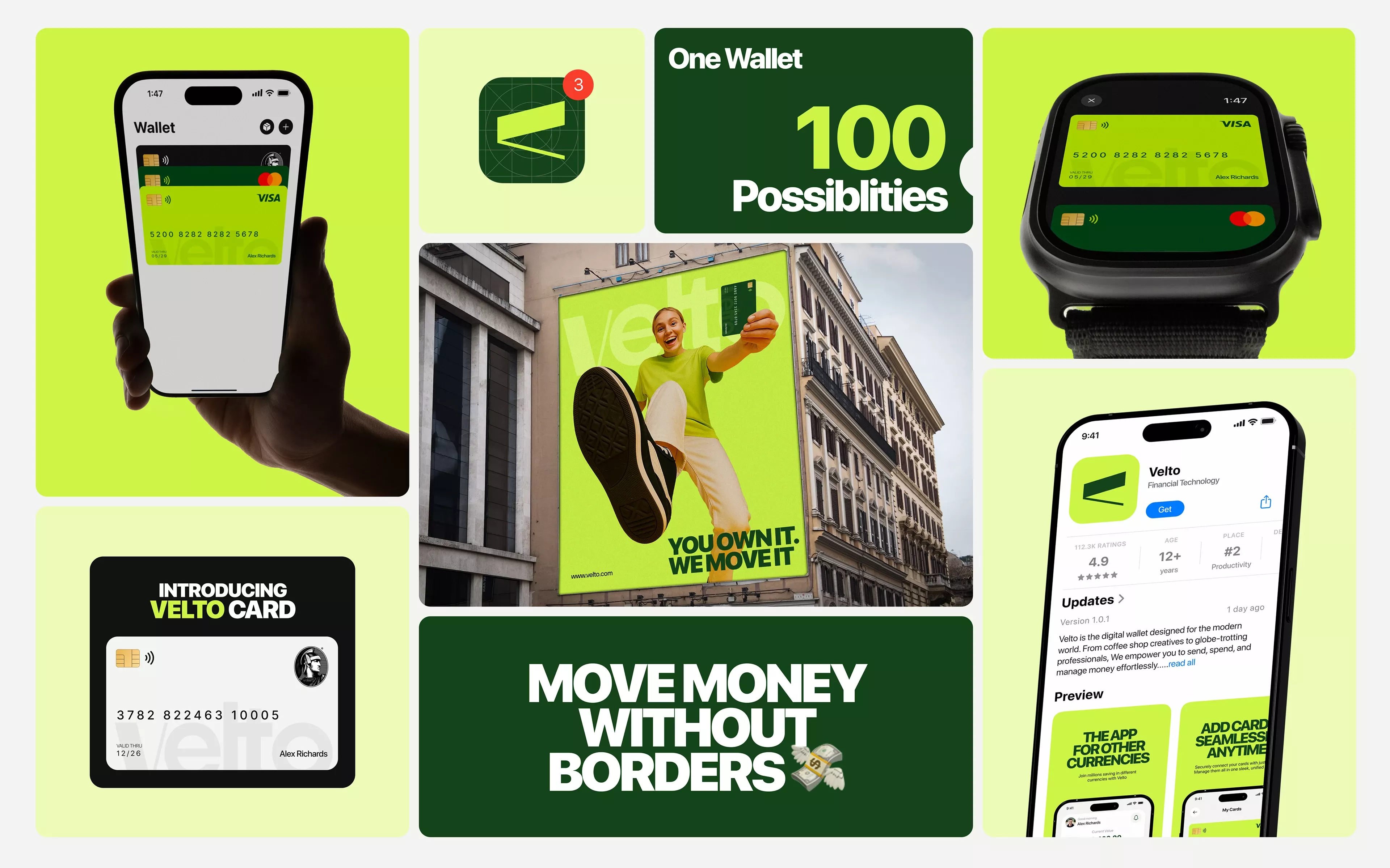 This is a highly structured promotional collage for a fintech mobile wallet service, emphasizing modern design and seamless digital transactions. The visual language is clean, utilizing strong geometric shapes and vibrant green accents to convey trust and accessibility.
