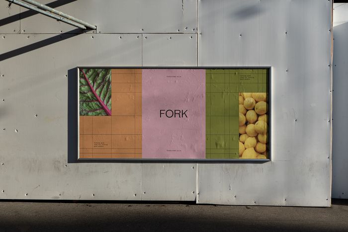 This design employs a minimalist, geometric approach, utilizing large, flat blocks of color to create a segmented composition. The visual language juxtaposes soft, warm tones with cooler greens and yellows against a raw industrial backdrop. The overall feel is clean, contemporary, and subtly playful.