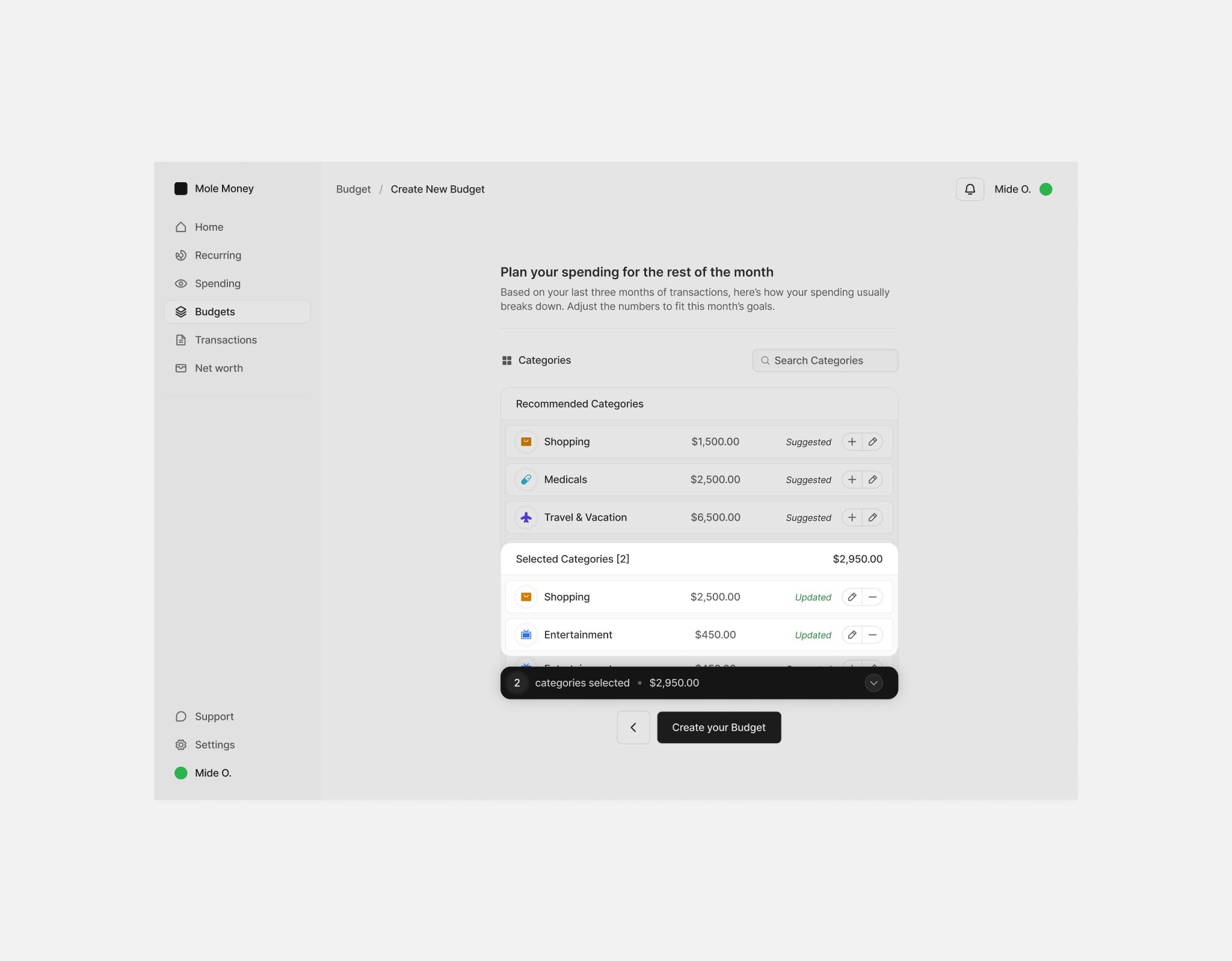 The design presents a highly functional and clean interface typical of personal finance applications, prioritizing clear navigation and data organization. The visual language is minimalist, relying on ample white space to ensure readability and focus on the financial data.