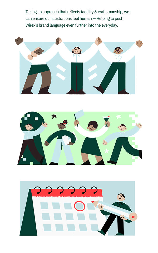 This set of illustrations employs a clean, flat design aesthetic to depict themes of teamwork, productivity, and time management in an accessible manner. The visual language is warm and encouraging, using simple figures and clear symbolic representations to convey a message about effort and collaboration.