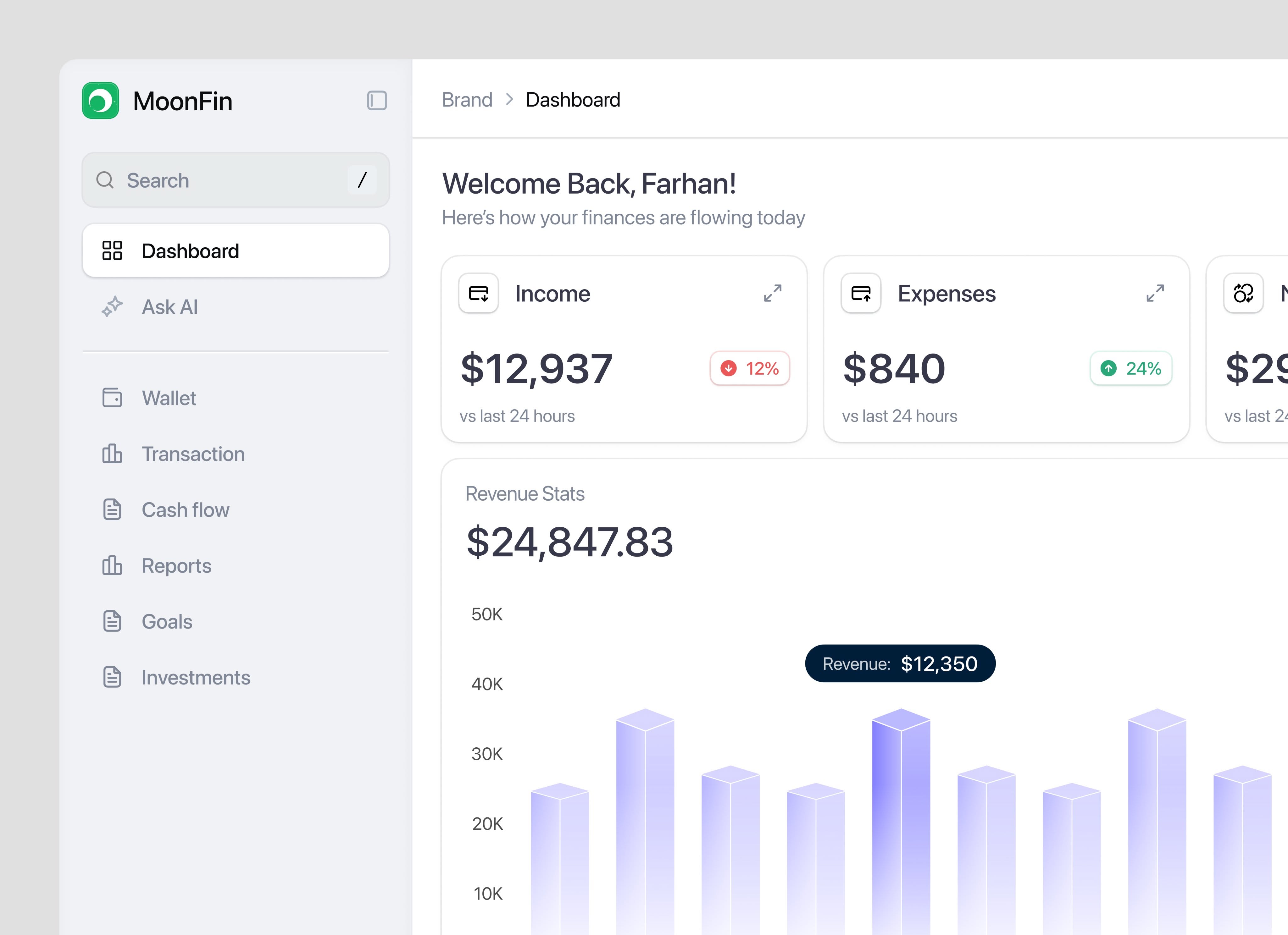 This design presents a clean, data-dense financial dashboard utilizing a light background and cool blue accents to guide the user's attention to key metrics. The visual language is straightforward and functional, prioritizing readability and clear representation of financial flows.