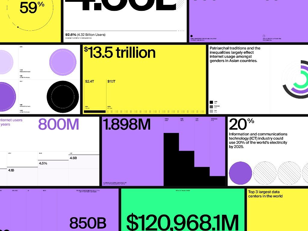 The image is a data visualization collage characterized by bright, saturated colors and stark contrasts between large numbers and simple graphical elements. It employs a modular layout to present various statistics quickly, giving it a dense, infographic feel.