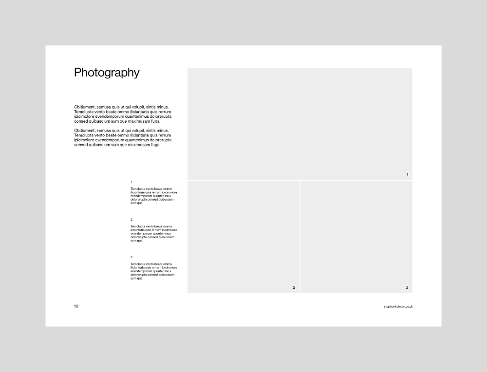This is a highly professional and minimalist layout characterized by strong typographic hierarchy and extensive use of negative space. The design employs a classic, clean editorial style, focusing purely on readability and the presentation of content.