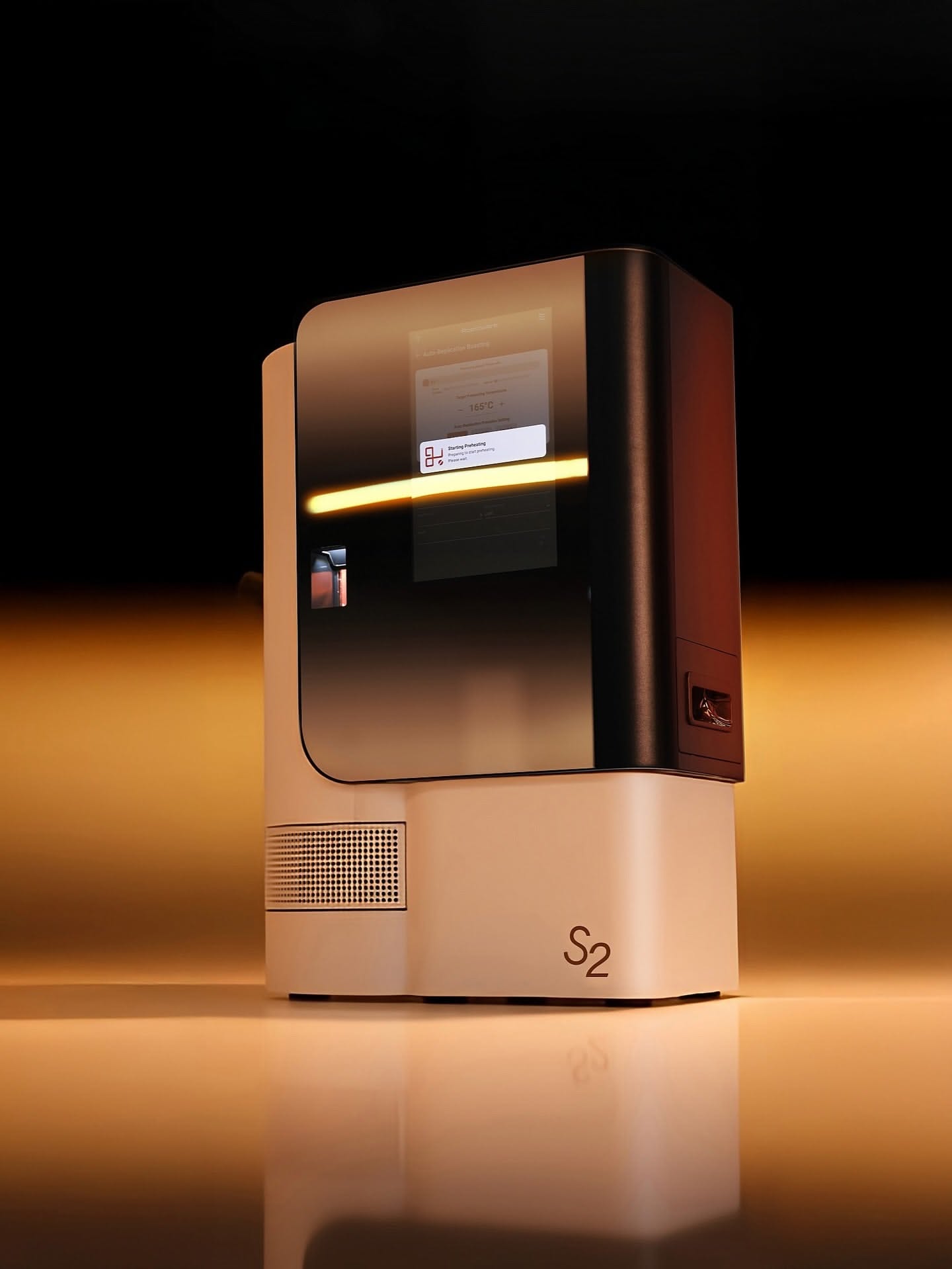 This image presents a sleek, minimalist piece of electronic hardware characterized by warm, rich tones and subtle internal lighting. The design emphasizes clean lines and a premium, understated technological aesthetic.