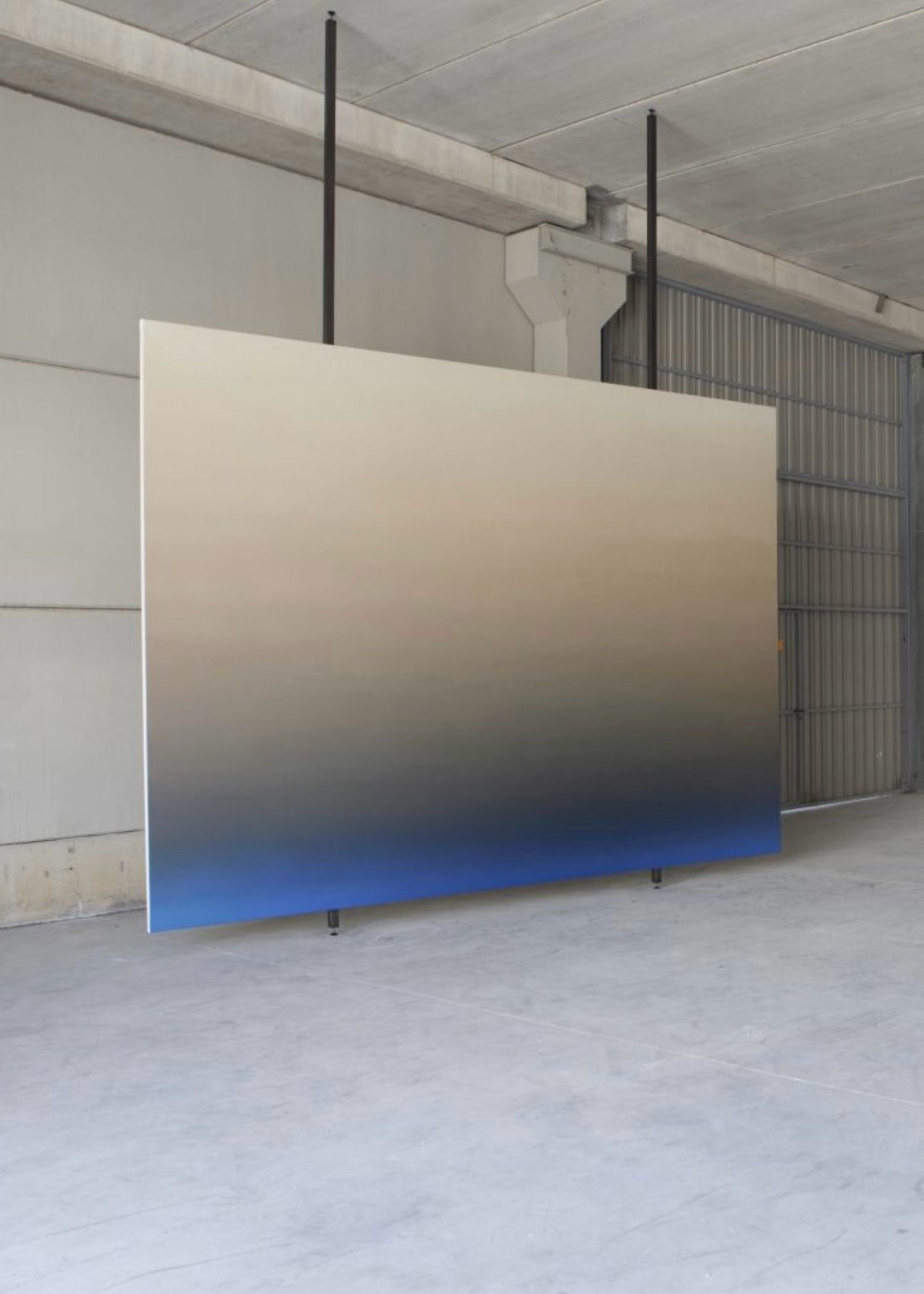 The image presents a study in contrast between smooth, softly graded geometric forms and a raw, textured industrial environment. The design relies on minimalist composition and a subtle color transition to create a sophisticated, atmospheric visual experience.