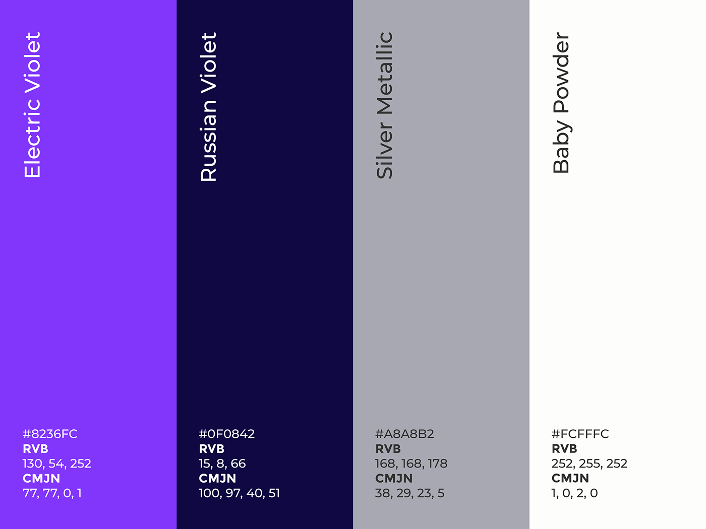 This image functions as a highly structured color palette presentation, showcasing four distinct, cool-toned hues with precise technical specifications. The design emphasizes harmony and contrast between the rich violets and the muted metallic gray.