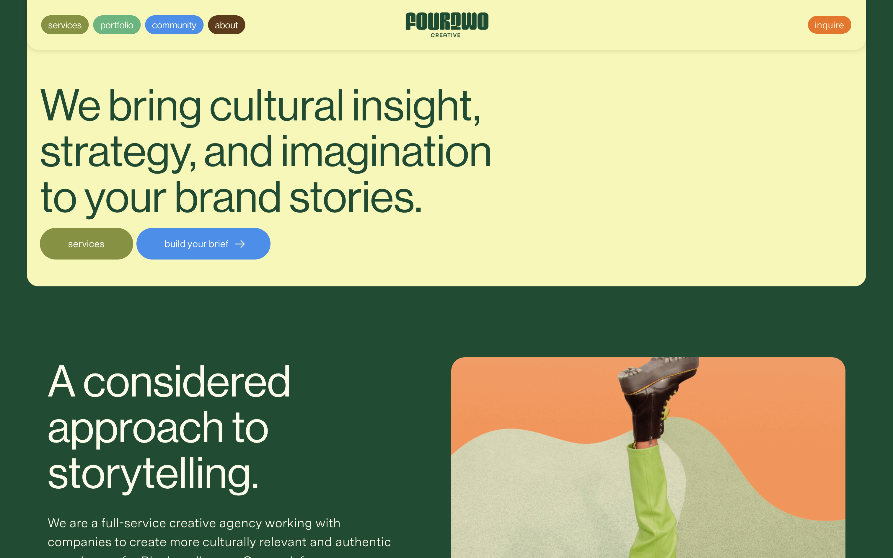 This design employs a clean, modern aesthetic using muted greens and earthy tones to convey professionalism and creativity. The visual language is professional yet evocative, successfully balancing strategic messaging with a hint of artistic flair through the photography.