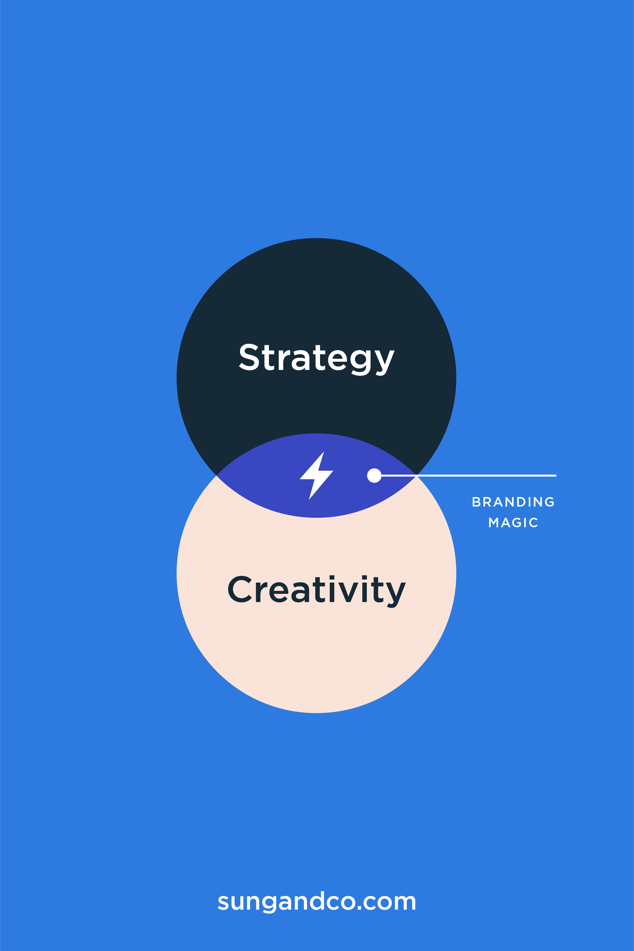 A minimalist, modern design featuring two overlapping circles with contrasting text labels, set against a vibrant blue background. The composition uses geometric shapes and a limited color palette to communicate the intersection of strategic thinking and creative execution. The design conveys a professional yet approachable aesthetic typical of contemporary branding and design agency work.