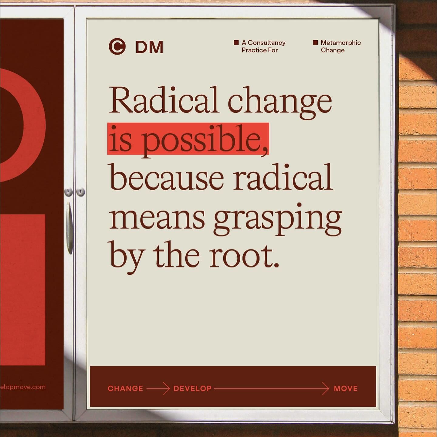 This design utilizes a clean, high-contrast aesthetic typical of modern corporate branding, focusing on strong typography and clear visual hierarchy. The visual language suggests transformation and depth, grounding the message in a serious, professional tone.