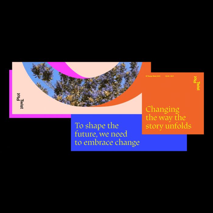 This is a modern, abstract graphic design piece utilizing bold color blocking and organic shapes to convey a theme of transformation or narrative development. The composition is clean yet dynamic, using curved segments to draw the eye across the visual field.