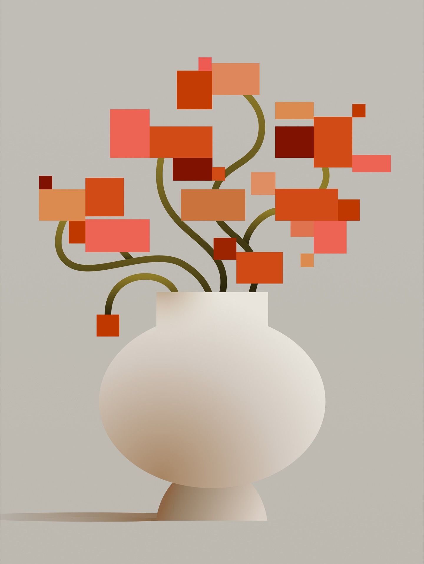 This is a minimalist and organic floral arrangement illustration characterized by blocky, rectangular elements in warm, muted tones. The design employs a soft, contemporary aesthetic with a focus on subtle color variation and natural, flowing lines.