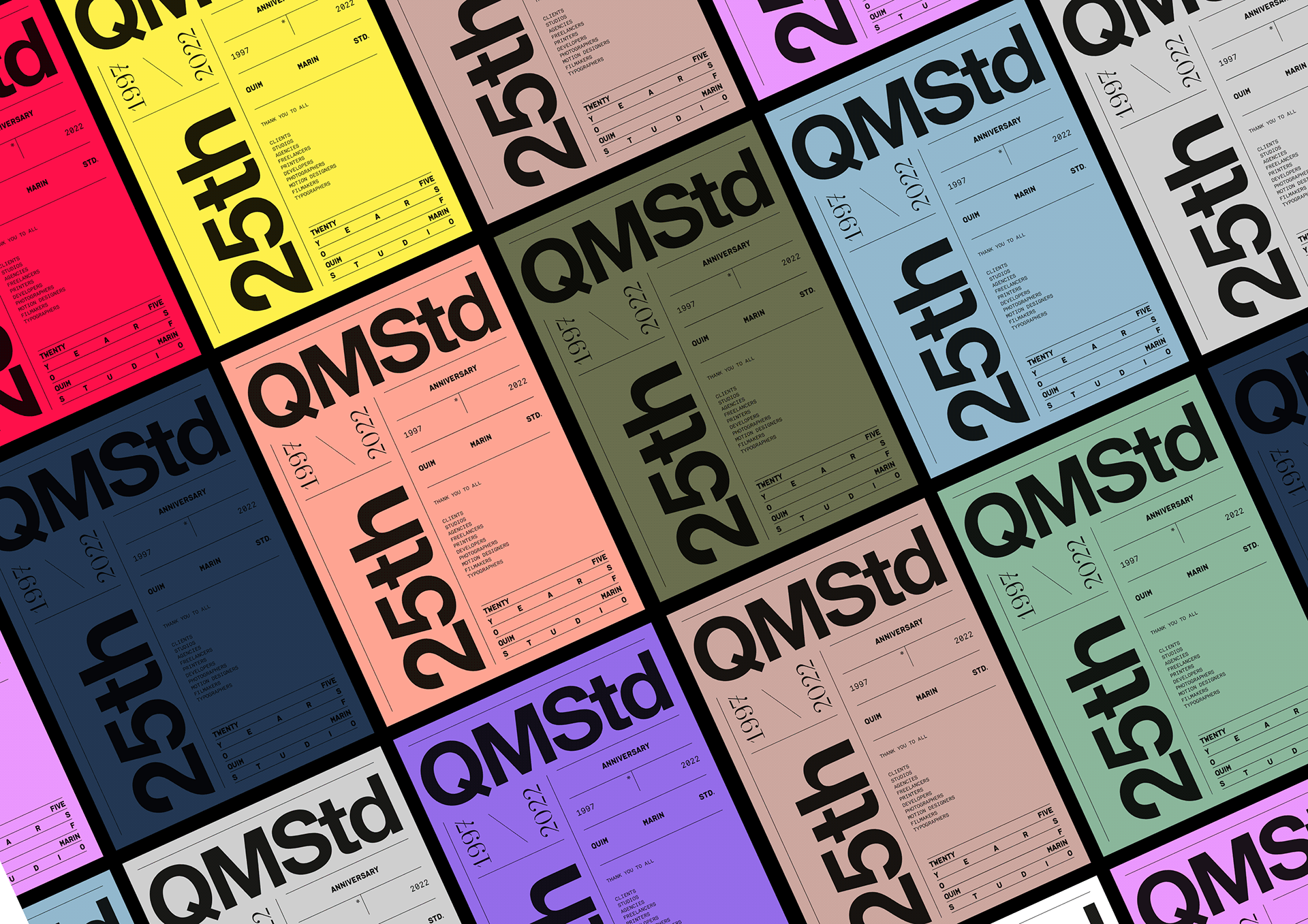 This design utilizes a high-contrast, repetitive typographic pattern to establish a strong brand identity. The visual language is bold and direct, relying on the contrast between the deep red background and the lighter text to create immediate impact. The overall feel is structured, promotional, and strongly branded.