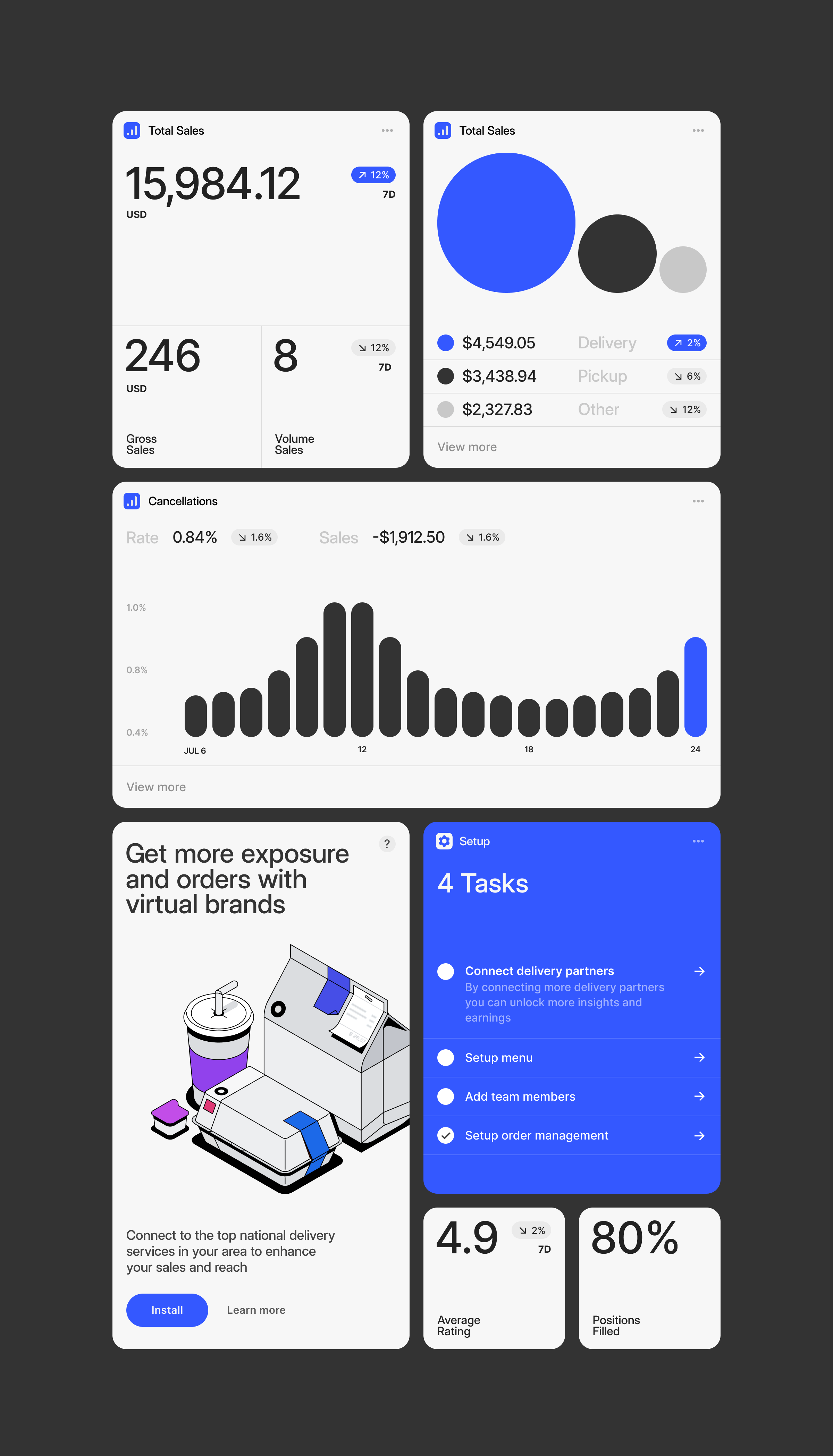 The image displays a clean, modern user interface design, likely for a business or analytics application. It utilizes a card-based layout with clear data visualizations like donut charts and bar graphs, emphasizing readability and professional functionality.