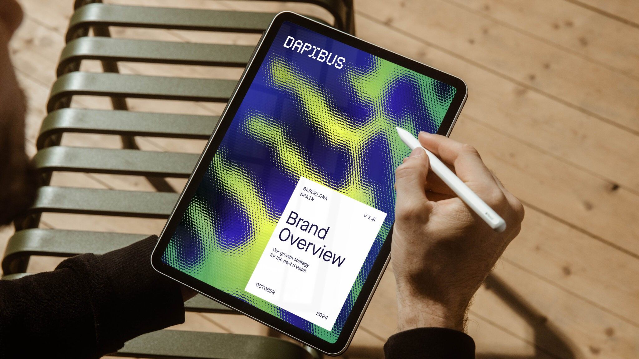 The image showcases a digital interface on a tablet, featuring a vibrant, abstract background pattern overlaid with white text and a handwritten annotation, suggesting a professional or analytical review process. The design balances bold color gradients with clean typography to present complex information in an engaging manner.