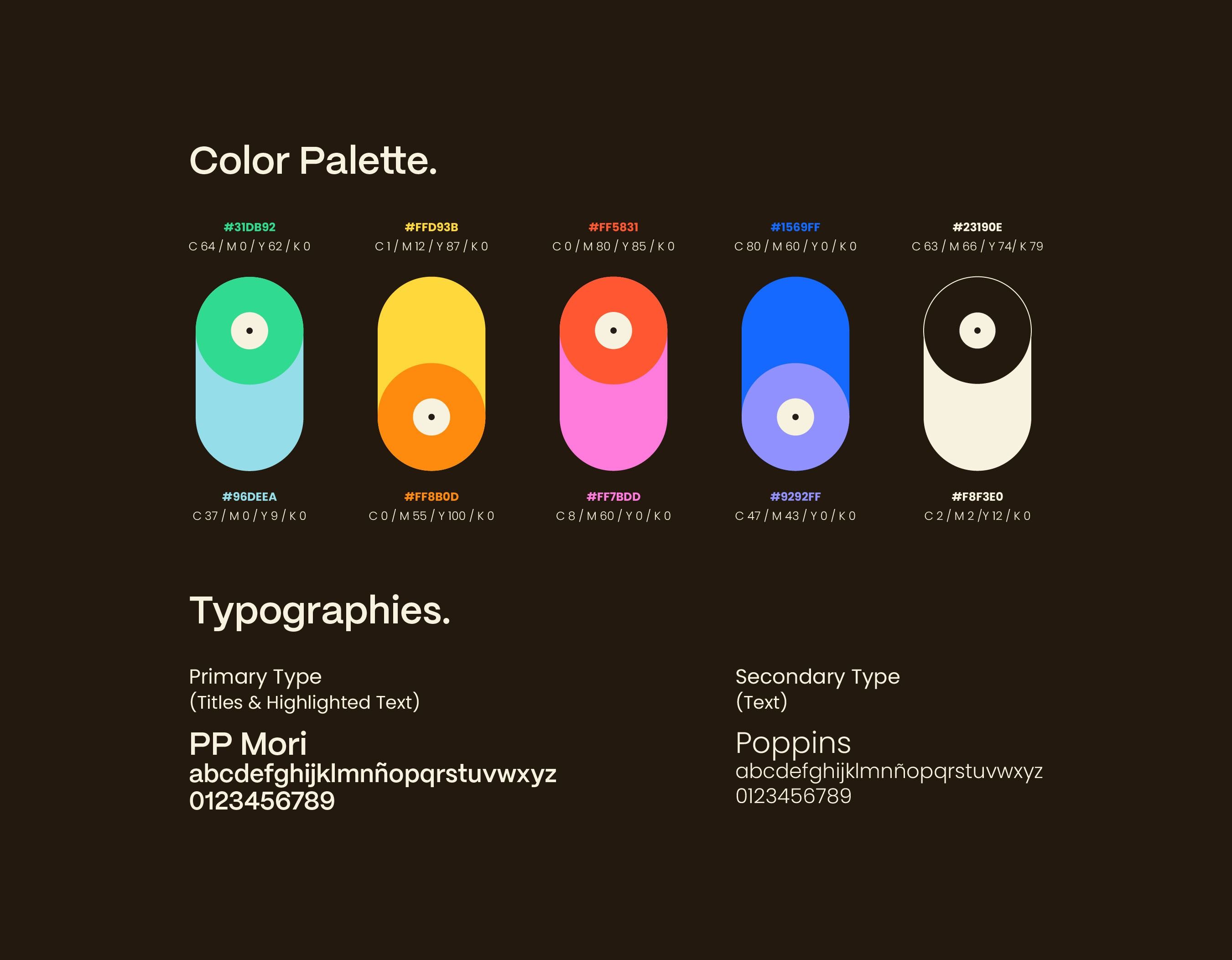 A modern design system showcase featuring a curated color palette and typography guide against a dark charcoal background. The layout presents five vibrant gradient color swatches with hex codes, alongside clean typography specimens demonstrating primary and secondary typefaces. The overall aesthetic is contemporary, minimalist, and professionally structured for design documentation.