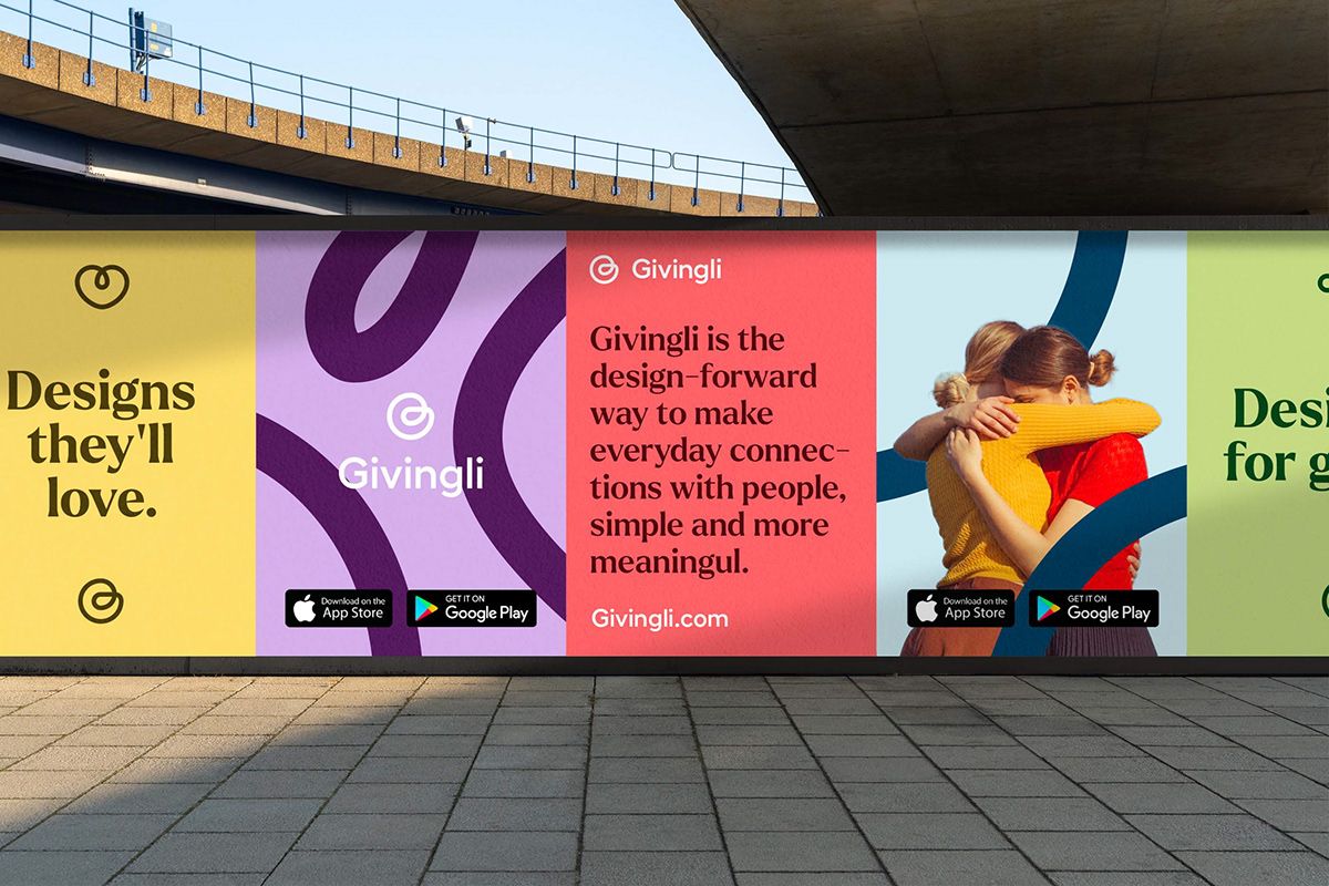 The image features a clean, modern digital display or billboard with a vibrant, segmented design promoting a brand named 'Givingli'. The visual language is bold and uses distinct blocks of color to separate key messages, conveying a sense of modern, approachable design.