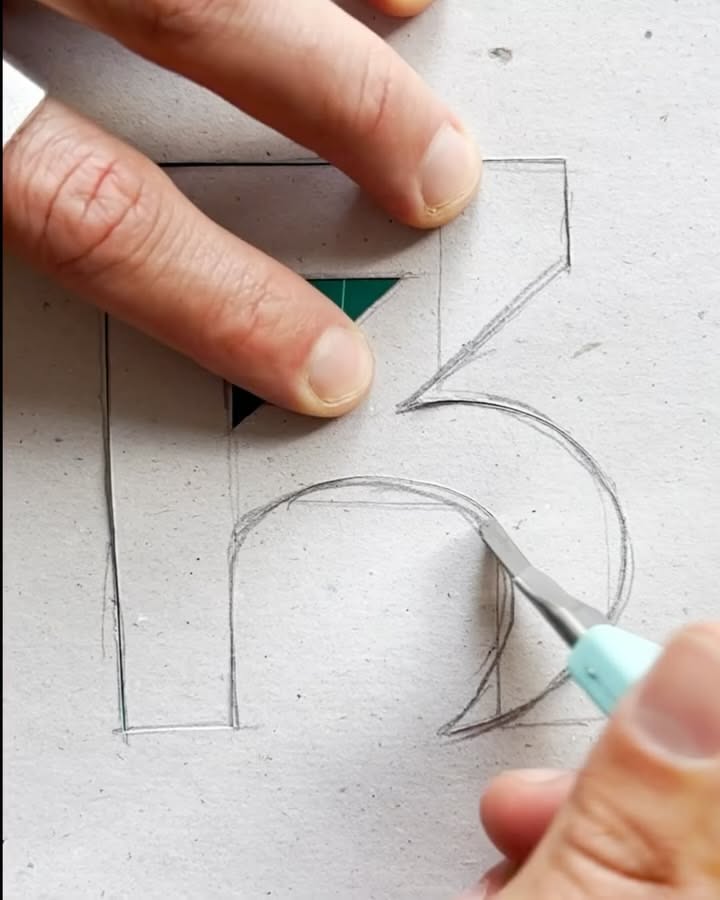 The image captures a close-up of a hand drawing or sketching letters on a light surface, suggesting a process of creation or design work. The visual language is raw and iterative, focusing on the line quality and the physical interaction between the tool (pen/knife) and the paper.