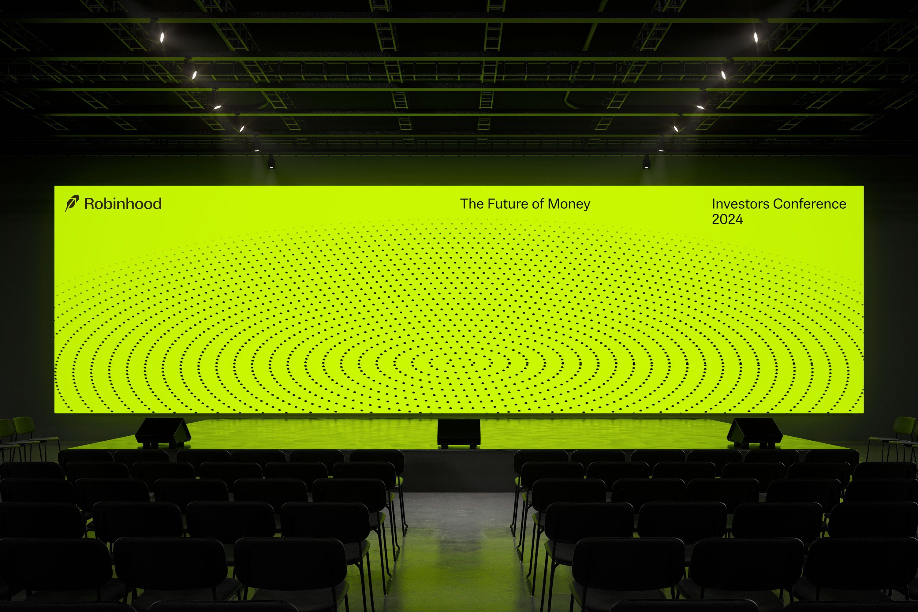 The image depicts a large, modern presentation stage setup characterized by high-contrast lighting and a dominant neon green color scheme. The design is clean, minimalist, and futuristic, aiming to convey innovation and corporate professionalism.
