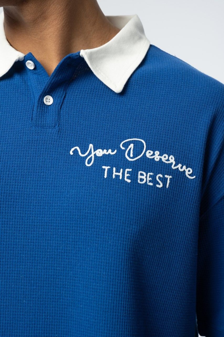 This image features a close-up of a vibrant blue polo shirt highlighted by elegant white script typography on the chest. The design emphasizes a clean, casual aesthetic combined with a motivational message, creating a sophisticated yet approachable visual statement.
