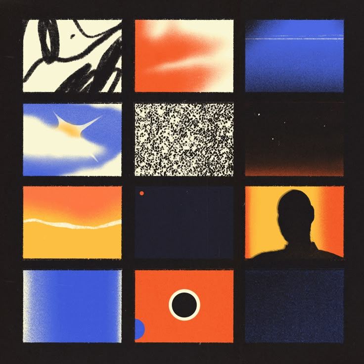 This image is a grid composition featuring abstract, textured, and photographic elements arranged in a modular layout. The visual language is stark, utilizing high contrast between deep blacks and vibrant, warm, and cool tones to create a modern, somewhat experimental aesthetic.