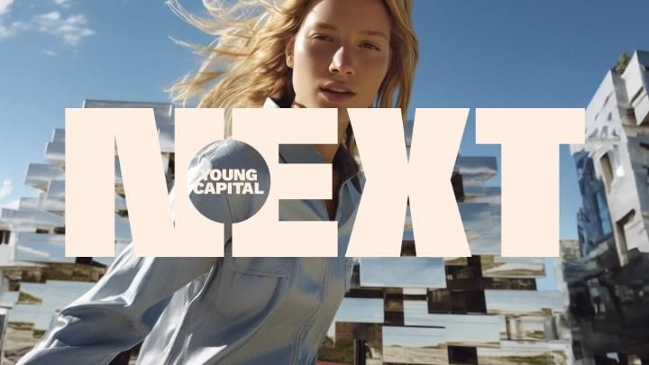 This is a high-fashion editorial shot characterized by bright, natural lighting and a strong sense of movement. The visual language is clean and modern, utilizing sharp lines of architecture juxtaposed with a confident female subject and large, bold typography to create an aspirational brand message.