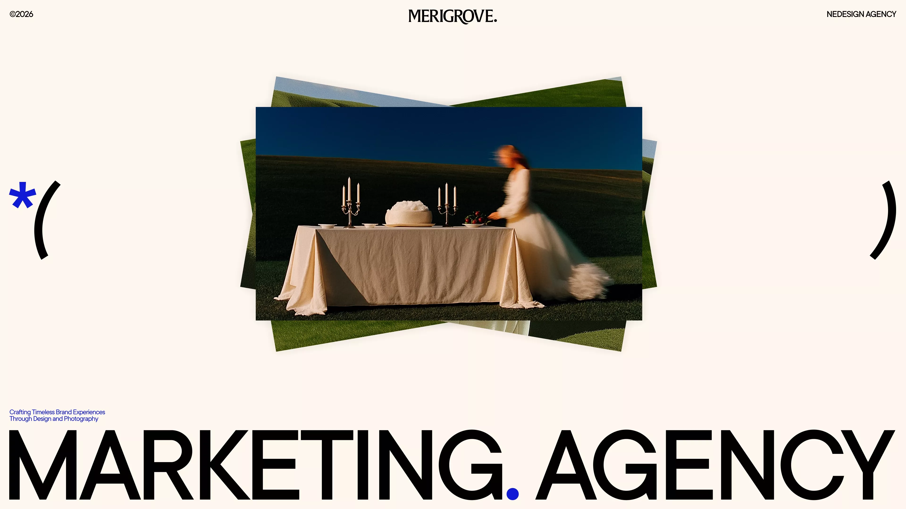 The image presents a minimalist and sophisticated layout, using a muted color palette dominated by earth tones and deep blues to create a serene yet elegant atmosphere. The composition focuses on a central, softly lit table setting against a broad landscape backdrop, suggesting themes of fine dining or high-end service.