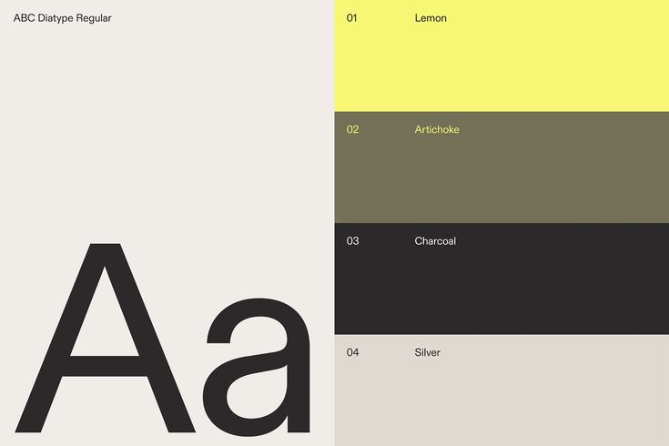 This image presents a clean, minimalist typographic exploration, focusing on a bold, sans-serif typeface against a muted, monochromatic background. The design relies heavily on subtle color blocking to organize information and establish a sophisticated, modern aesthetic.