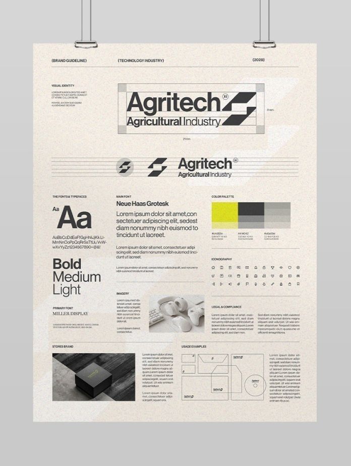 This design presents a highly structured and minimalist brand guideline page, emphasizing clarity and professionalism through strong typographic hierarchy and ample white space. The visual language is clean, modern, and corporate, successfully conveying a sense of technical expertise and reliability.