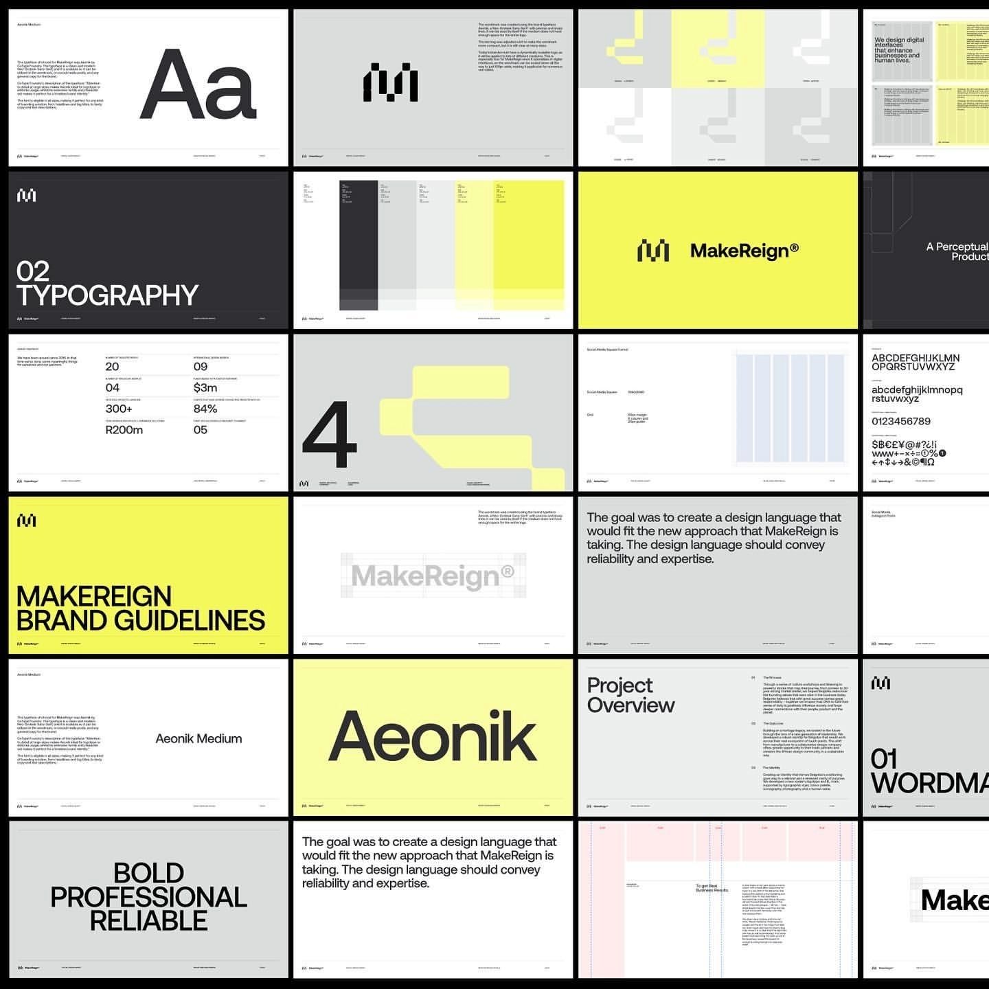 This collection showcases a highly structured, modern design language characterized by strong grid systems and minimalist aesthetics. The visual language relies on clean lines, ample negative space, and a sophisticated monochromatic palette punctuated by vibrant yellow accents to guide the user's eye.