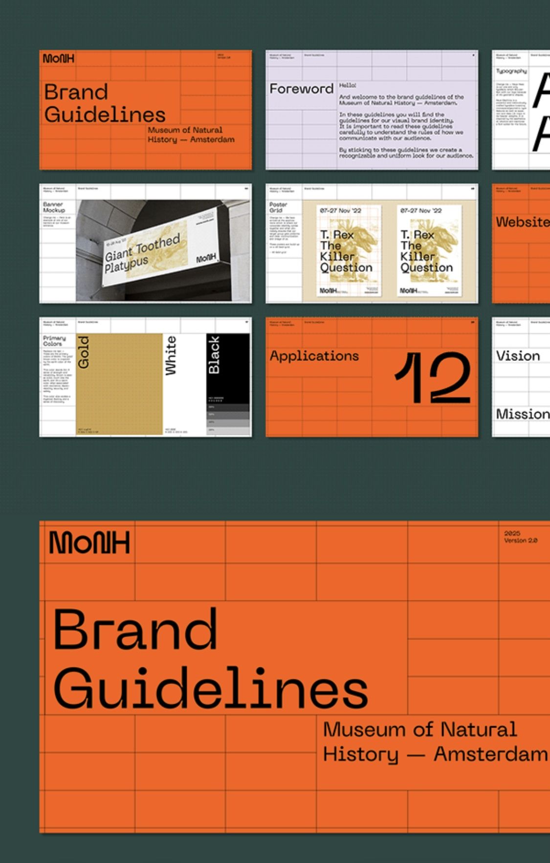 This design utilizes a clean, modular grid system with a warm orange and cool gray palette to present detailed brand guidelines. The visual language is highly structured, emphasizing clarity, hierarchy, and professional organization suitable for academic or corporate documentation.