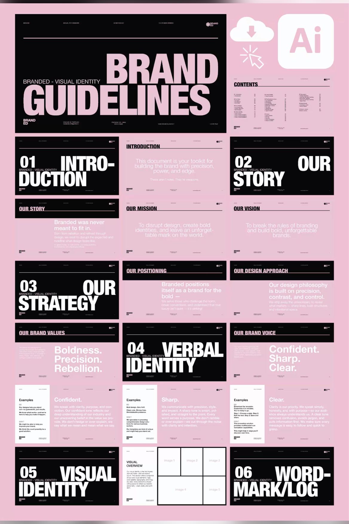 This is a highly structured and minimalist set of brand guidelines utilizing high contrast and ample negative space to convey professionalism. The visual language is clean, modern, and relies heavily on typographic hierarchy to organize complex information clearly.