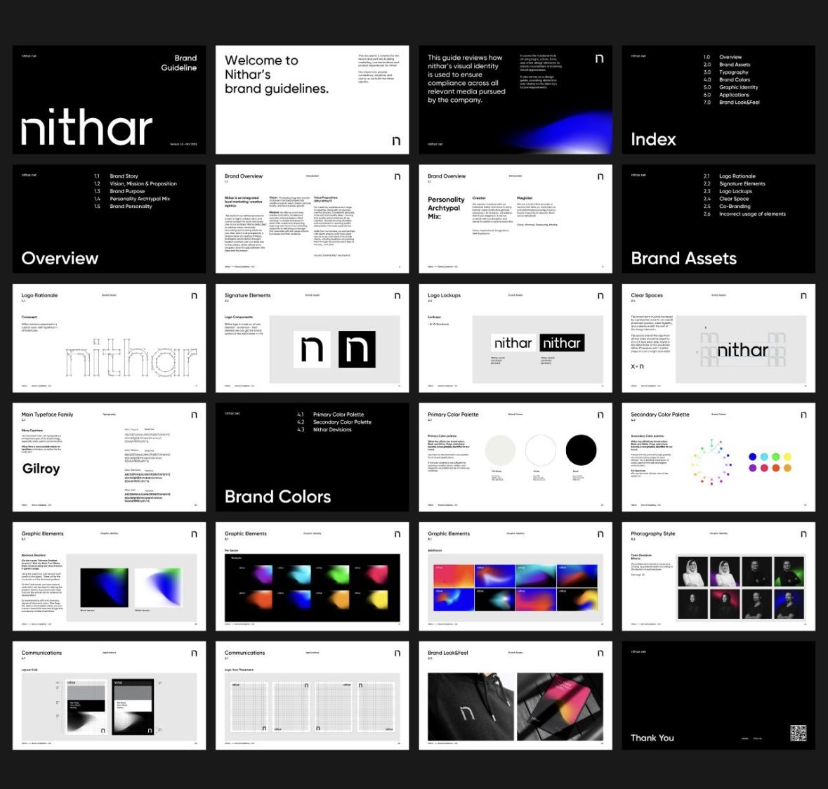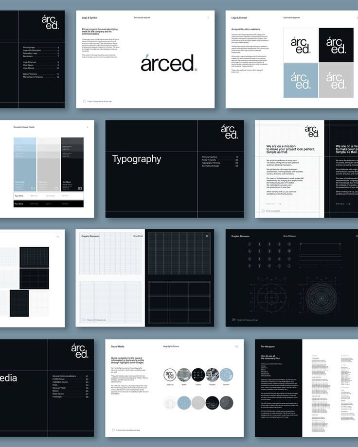 This is a highly structured and clean presentation of brand identity guidelines, utilizing a dark, muted color palette contrasted with crisp white text. The design emphasizes clarity, hierarchy, and professional branding through a modular grid layout.