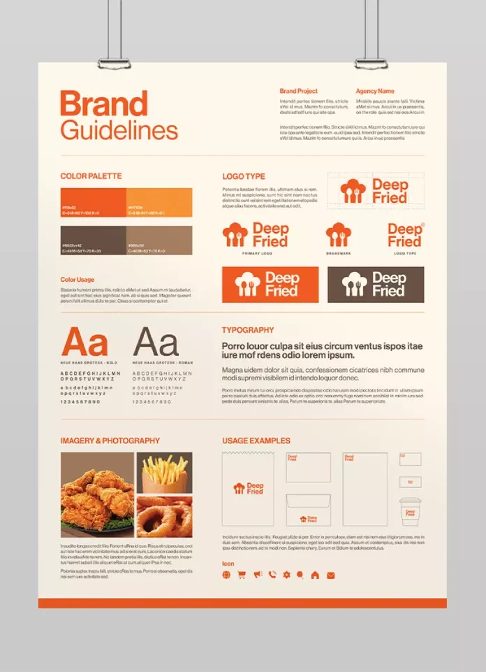 This is a highly structured brand guideline template characterized by strong horizontal divisions and clear hierarchy. The visual language relies on high contrast and warm, earthy tones to convey professionalism and approachability.