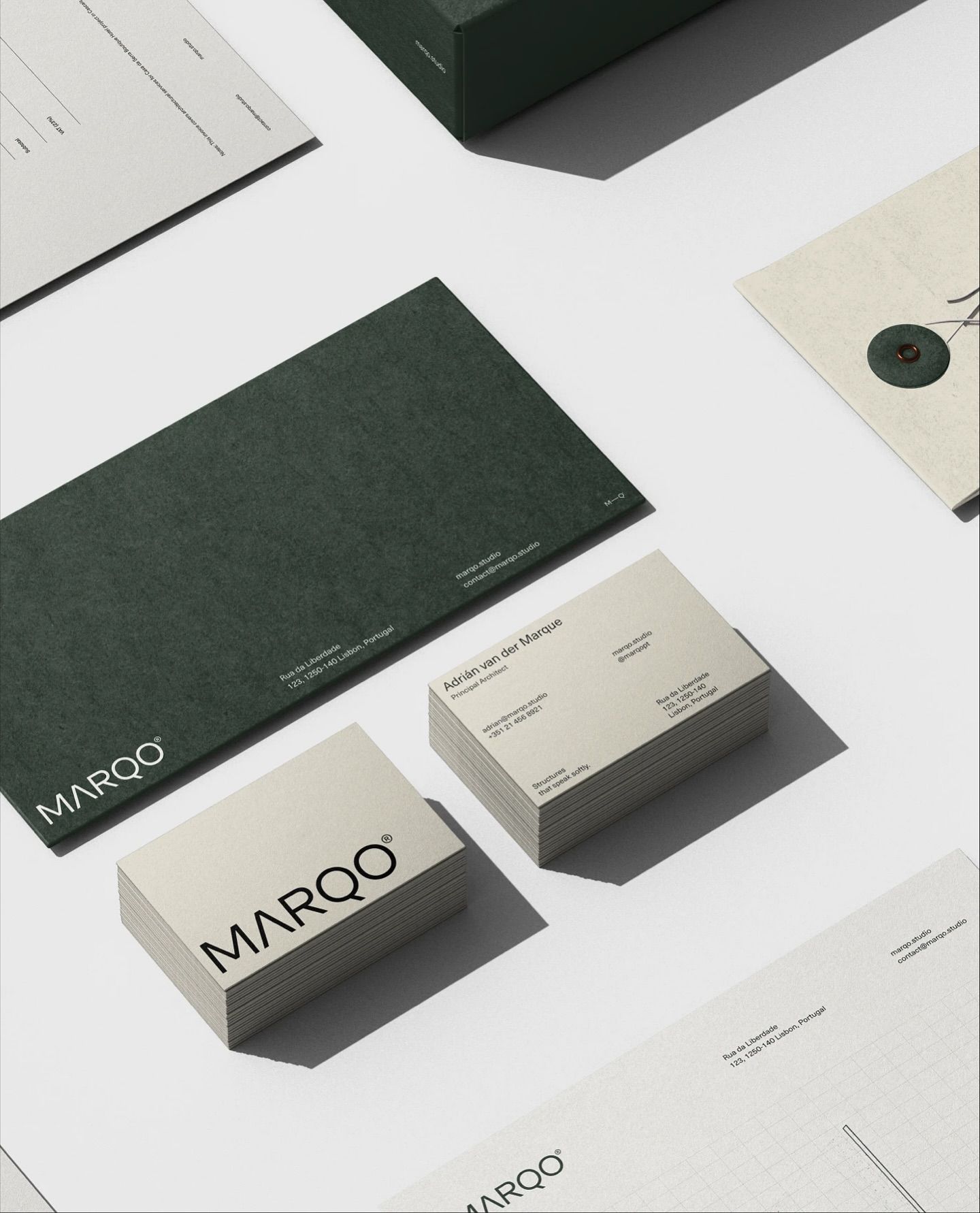 This visual display showcases a high-end, minimalist approach to branding and packaging design, emphasizing texture, precise alignment, and sophisticated negative space. The overall language is clean, refined, and evokes a sense of premium quality through muted tones.