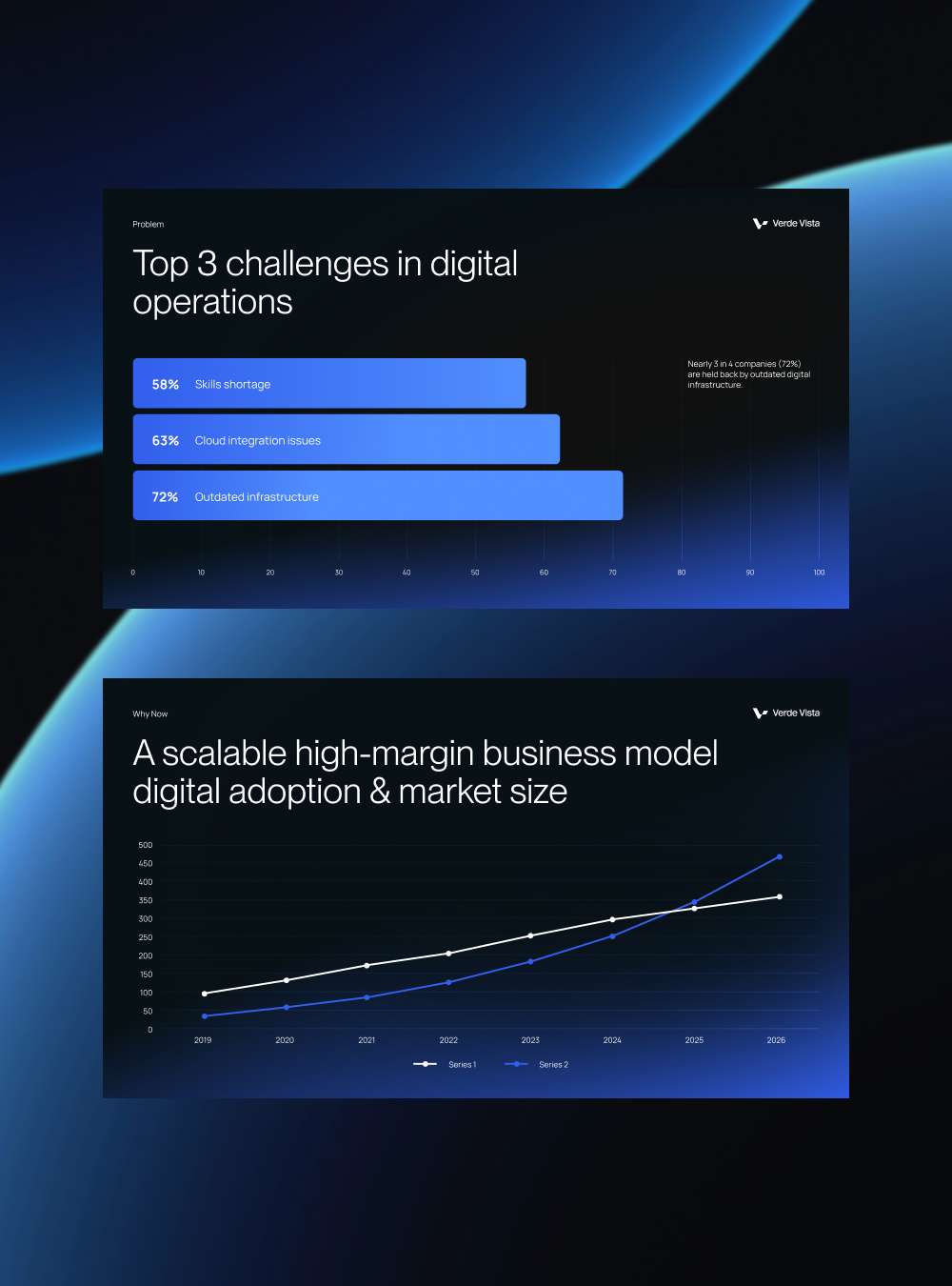 This image presents two distinct data visualizations set against a deep blue background, emphasizing corporate and analytical reporting. The design utilizes clear bar charts and line graphs to communicate complex business challenges and growth trends effectively.