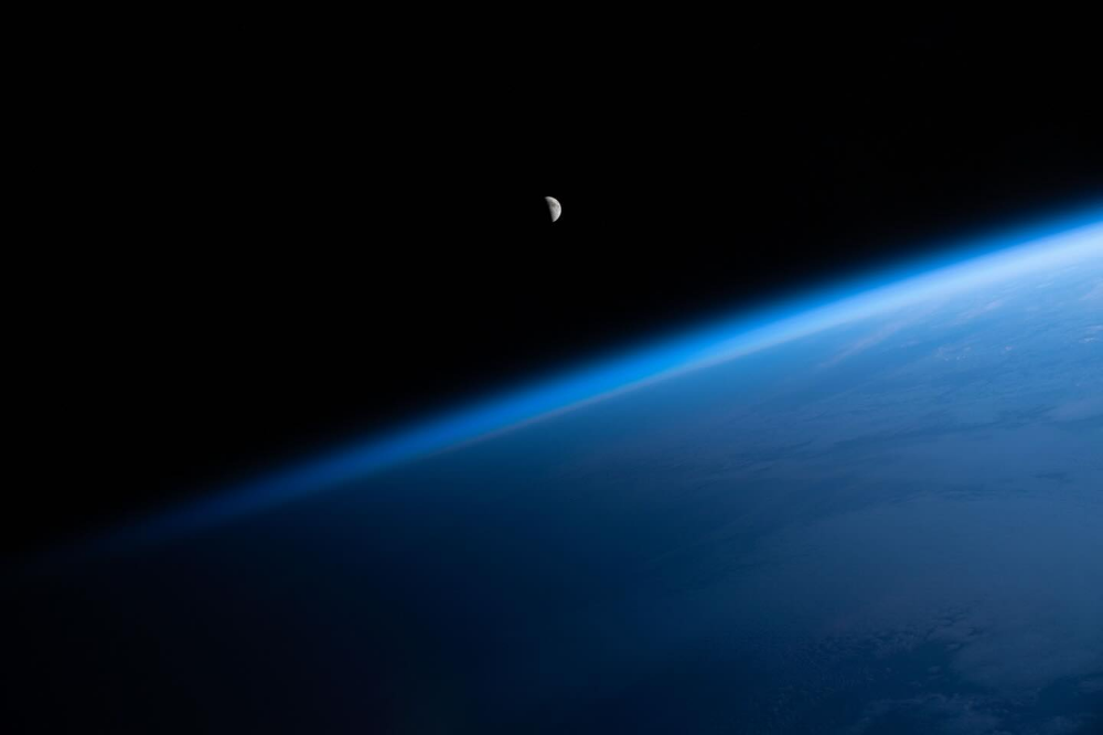 This image captures the immense scale of the cosmos, emphasizing the stark contrast between the deep black void and the luminous blue curve of the Earth's atmosphere. The visual language is minimalist and dramatic, focusing on the sublime beauty of planetary scale.