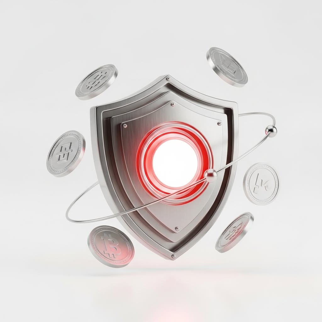 This image features a highly polished, three-dimensional shield rendered in metallic tones, emphasizing strength and protection. The visual language combines classic heraldic shapes with modern, dynamic floating elements, creating a sense of motion and high-tech security.
