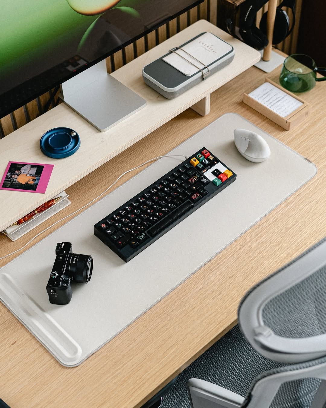 This image presents a highly organized and minimalist workspace emphasizing natural materials and functional technology. The visual language relies on clean lines, warm wood tones, and an uncluttered arrangement to create a serene yet productive atmosphere.