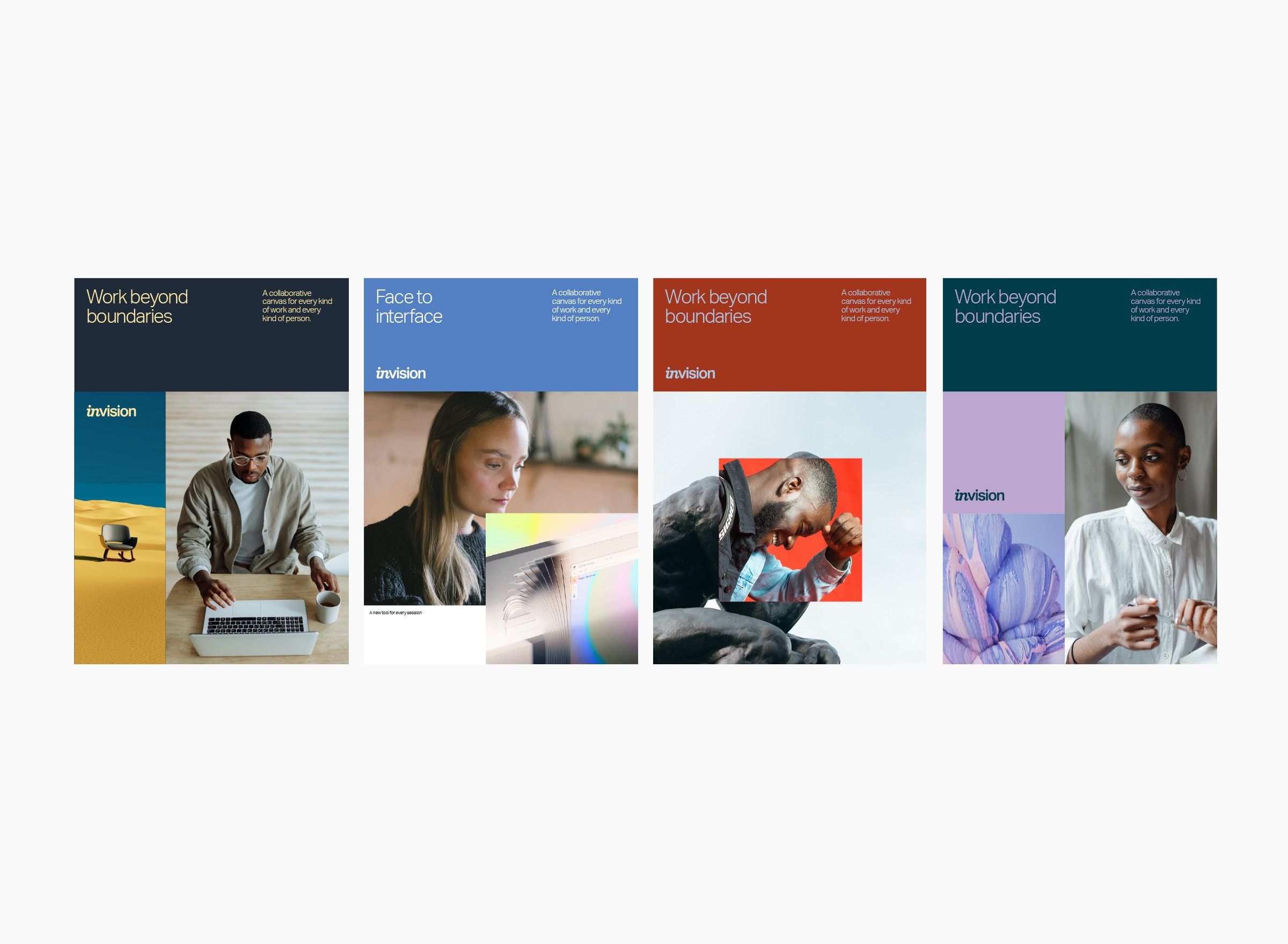 This is a series of cohesive, modern visual cards or panels presenting different facets of a concept related to 'Invision' or boundaries. The design uses clean layouts, strong photographic elements, and a restrained color palette to convey professionalism and depth.